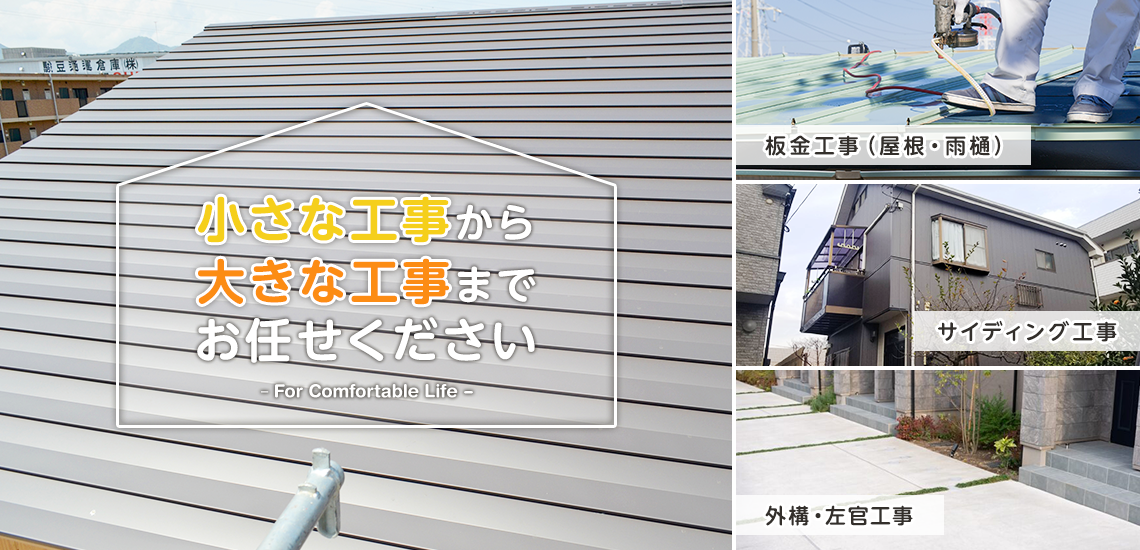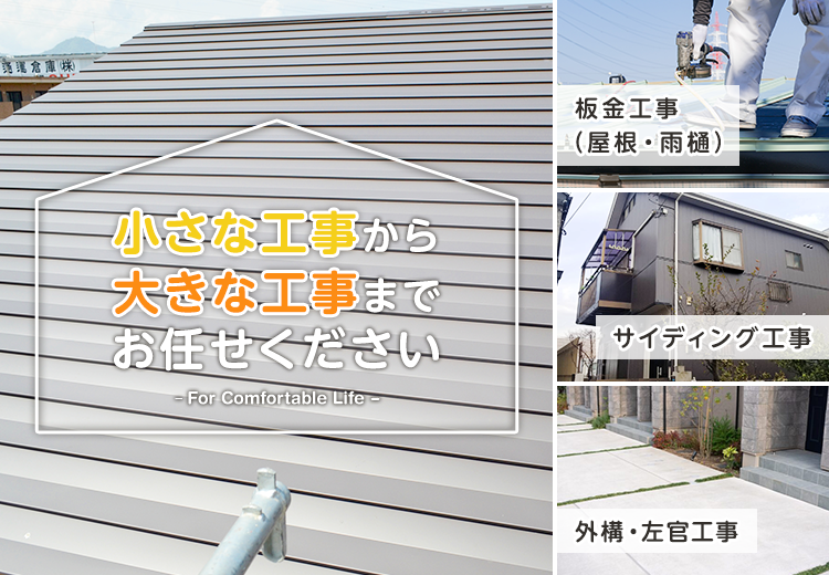 当社は、板金工事(屋根・雨樋)やサイディング工事、外構工事などのご依頼を承っております。
